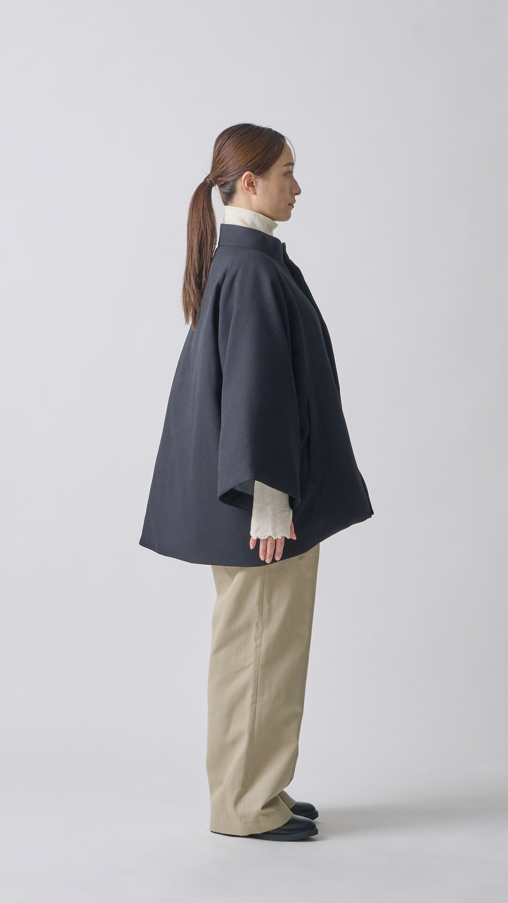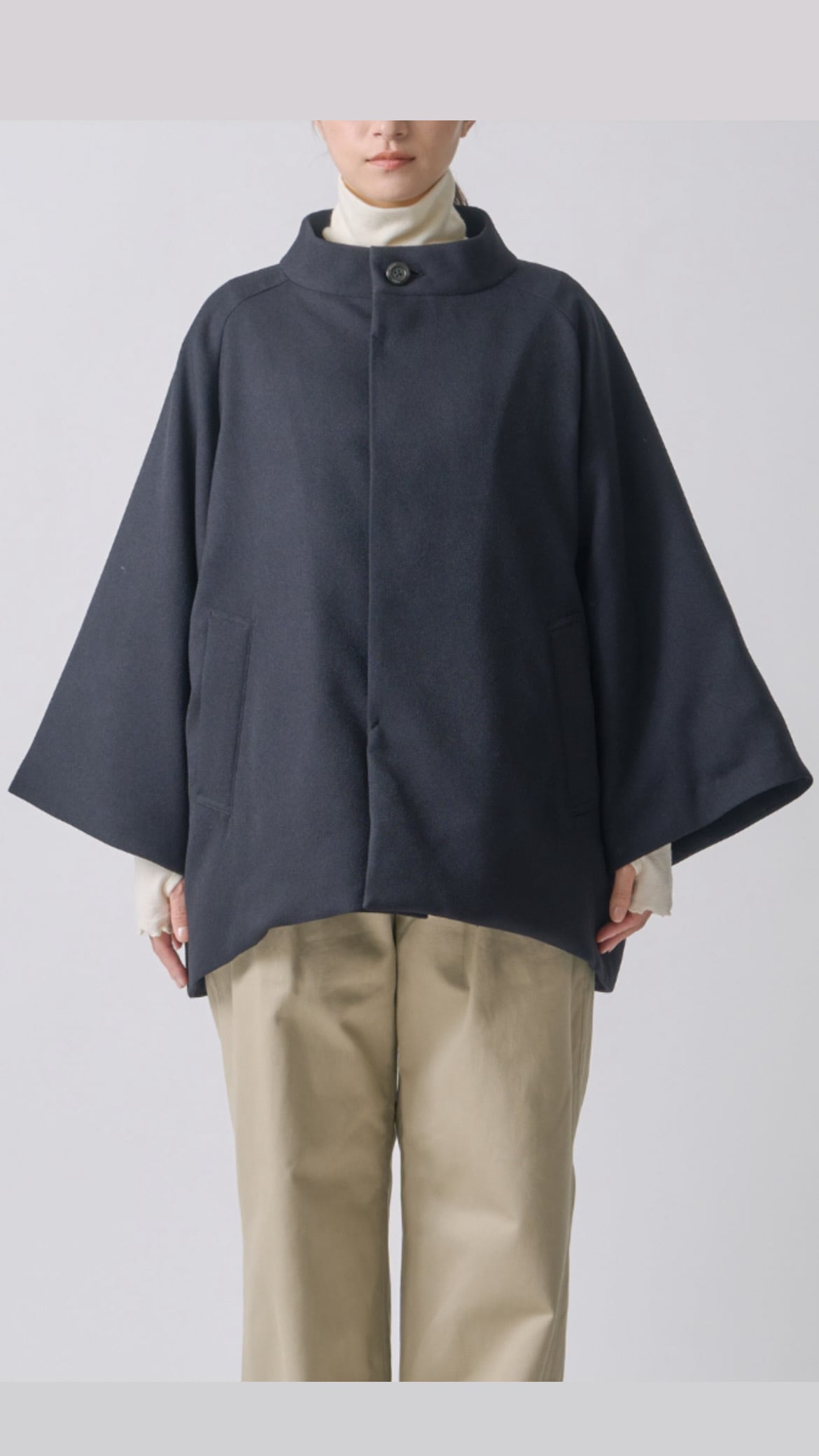 ケープのようなルックスのシンプルなAラインコート。身頃と袖がそれぞれやや短めでゆったりとした作りなので、手袋など冬小物を合わせやすく、ボリュームのあるニットの上からでもストレスなく羽織ることができます。首や顏との干渉を抑えたモックネックラインで、フロントは衿元だけボタンが見える比翼仕立て。