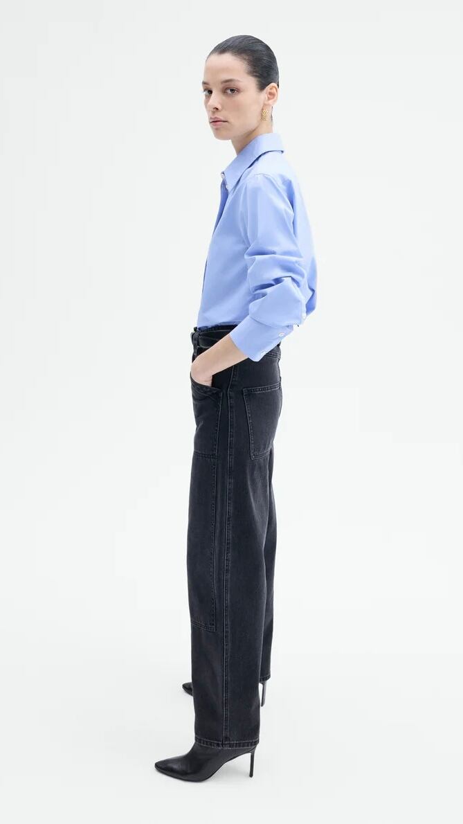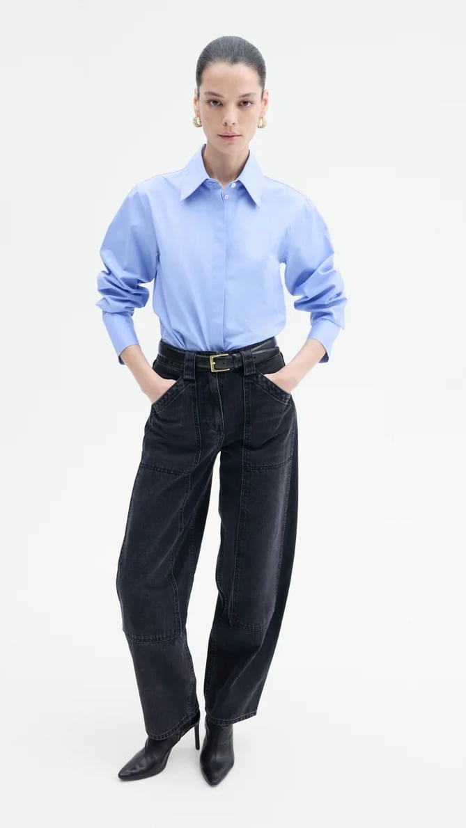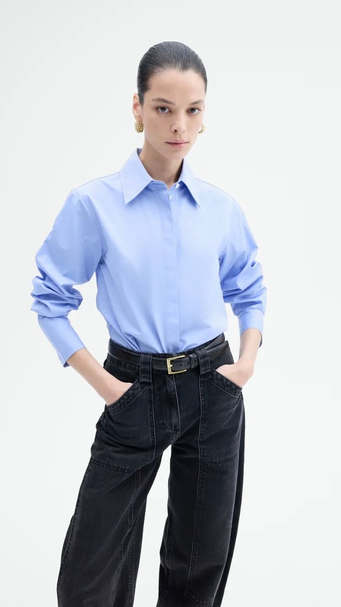 コットンのストレートカットのボタンダウンシャツ。バイアスバインディング。スカートやズボンに押し込むように作られています。