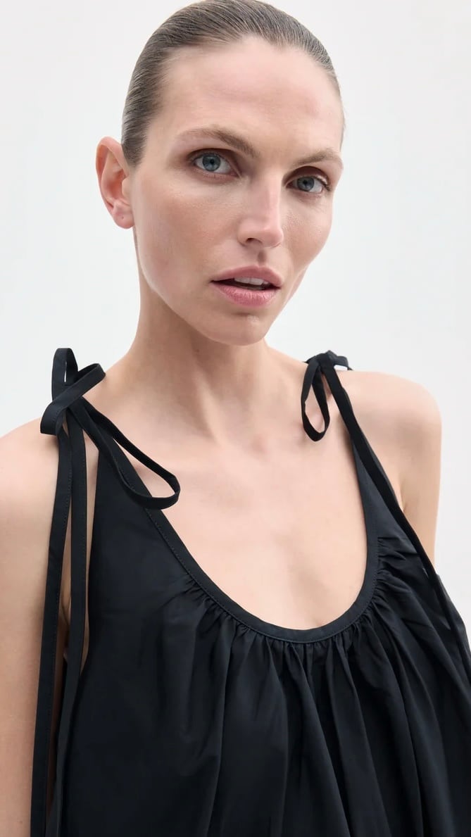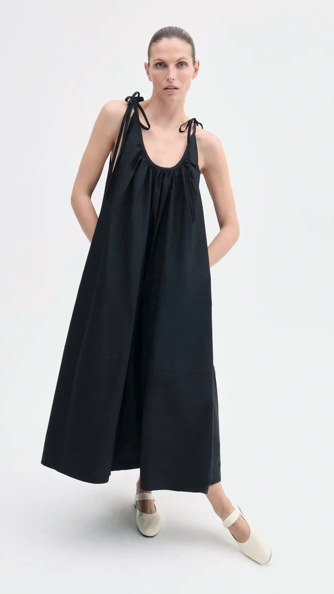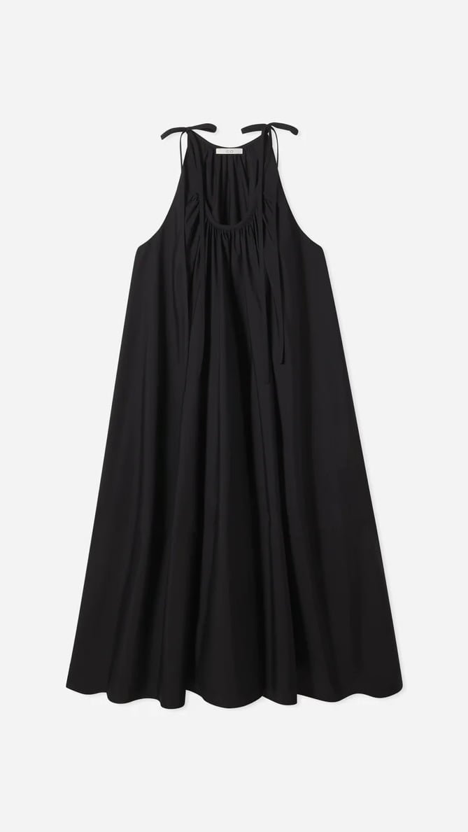 さわやかなコットンポプリンを使用した、サマードレス。低めのUネック、胸元にギャザーが入っています。調節可能なセルフストラップで吊り下げられています。