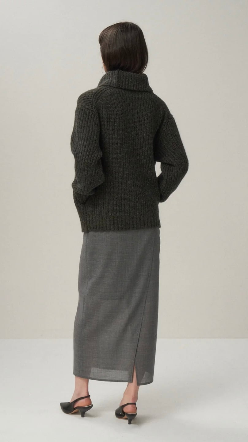 迫力ある衿が特徴のタートルネックのニットブルゾン。衿部分は折り返しても重くならないよう、一重で軽く仕上げています。編み続きの設計で生まれる目立てもポイントです。逆開ファスナーなので様々な着用感を楽しめます。