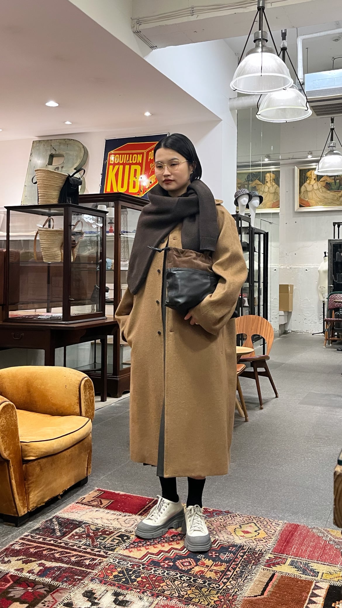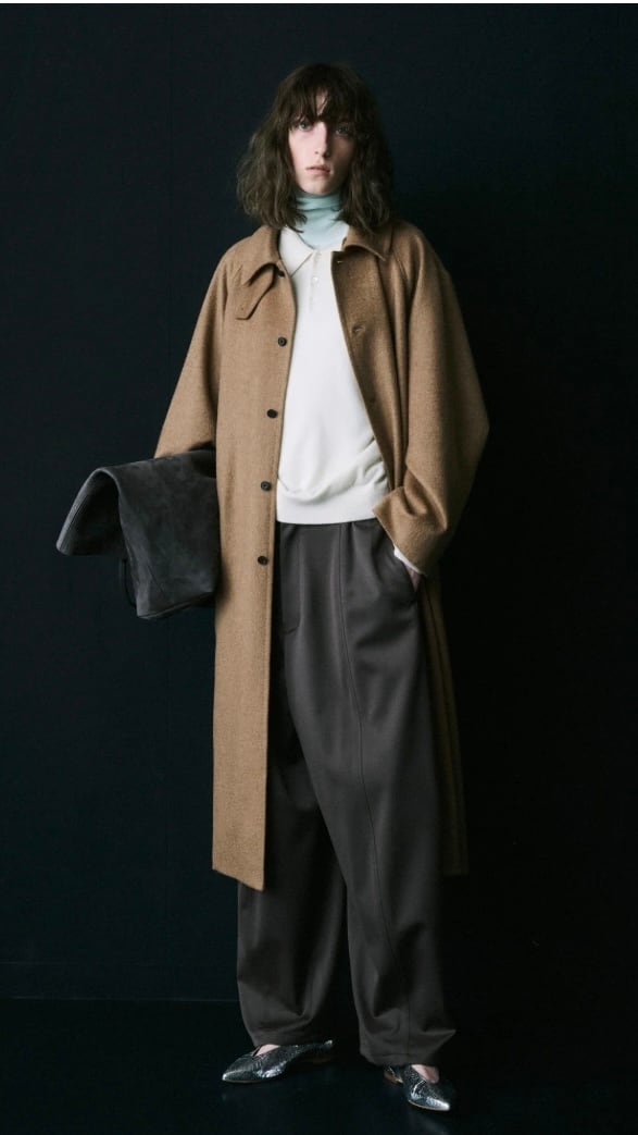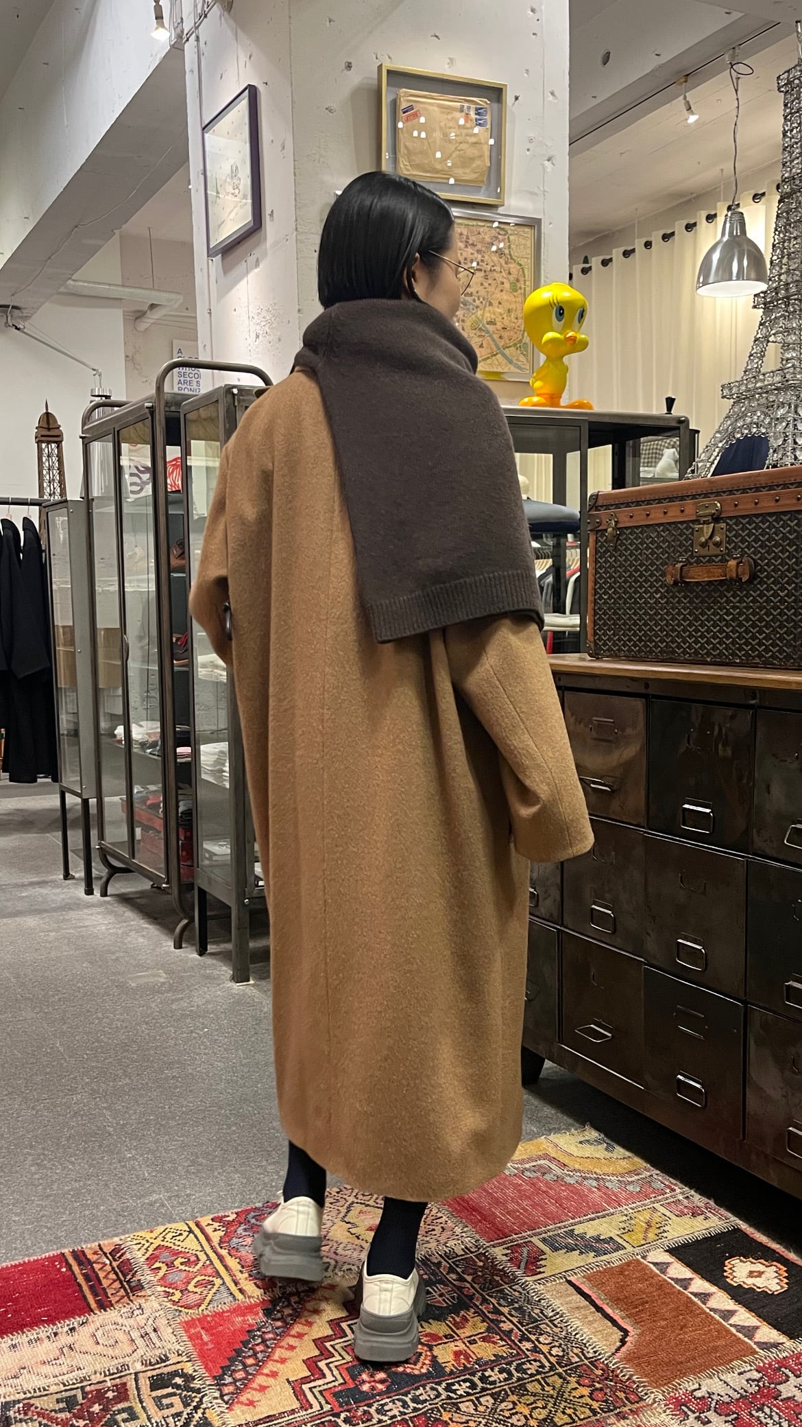 ストレートシルエットでロング丈のステンカラーコート。袖部分に縦にダーツを入れ、立体的なパターンでアレンジし、特徴づけをしました。裏地を、ハリと柔らかさをバランス良く持ち合わせたコットン生地を採用し、柔らかい表生地を保形させながらも着心地良く仕上げています。また、キャメル生地の毛足を邪魔しないように、ステッチワークはハンドステッチを施しています。