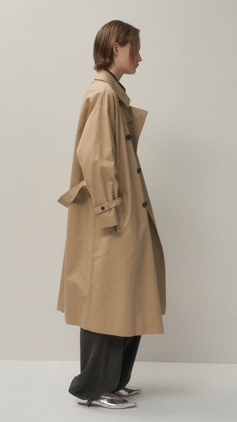 ディテールを極限まで省いた、ATON定番のトレンチコート。100年ほど前のトレンチコートをベースに、当時の貴重なディテールを随所に実現しつつ、現代の環境に合わせてデザインアップデートしました。ウエストベルトをぎゅっと絞っても、柔らかい生地が綺麗なシルエットを作り出します。