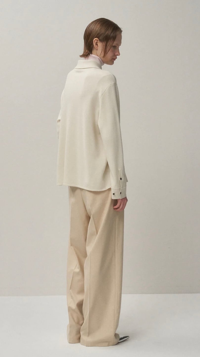 ゆったりしたサイズ感のニットシャツ。パターン設計、剣ポロや胸ポケットなどシャツ仕立てにこだわっています。01・02サイズの2サイズ展開で、02サイズはイレギュラーグレーディングでオーバーサイズのシャツアウターとして着られる設計。好みのコーディネートに合わせてサイズを選んでいただけます。