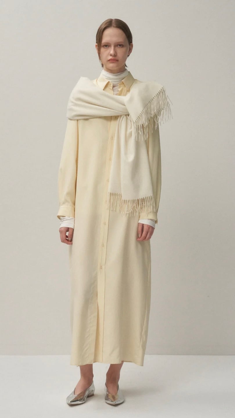 ややゆったりした身幅のストレートシルエットのロングシャツドレスです。第一ボタンを開けたり、ニットをレイヤードした際でも衿が広がらず美しい着姿でいられるようボタンダウンシャツの構造を比翼仕立てで作りこんだ、細部にわたって美しいシャツドレスです。後ろはさりげなくタックが入りオーソドックス過ぎずニュートラルなATONらしい空気感になっています。