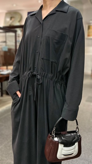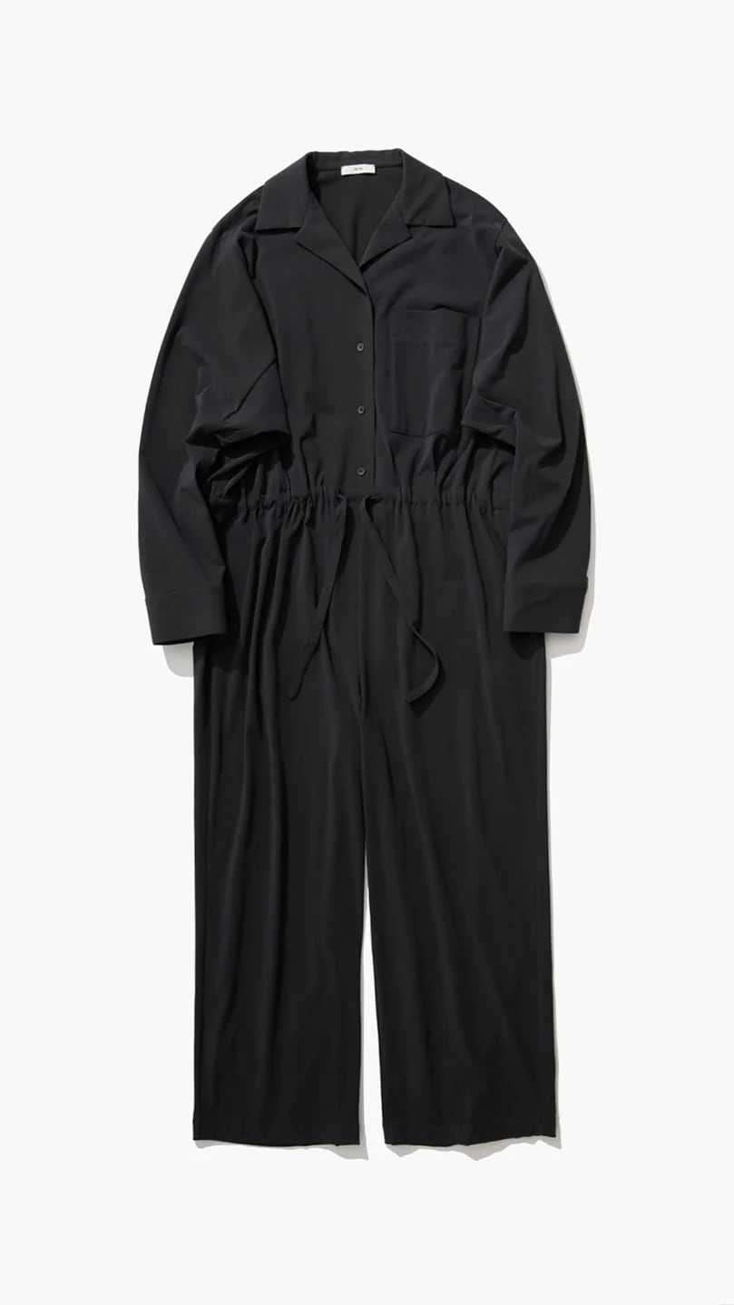 メンズの3XLくらいの身幅寸法のあるジャンプスーツ。ウエストの紐をぎゅっと絞り、ドレープを出して着用いただけます。パンツ部分の裾幅は、セミワイド程度の分量で落ち感があるので、トップスはブルゾンもロングコートも合わせやすくなっています。ジャージーならではのゆるい雰囲気が他にはないアイテムです。