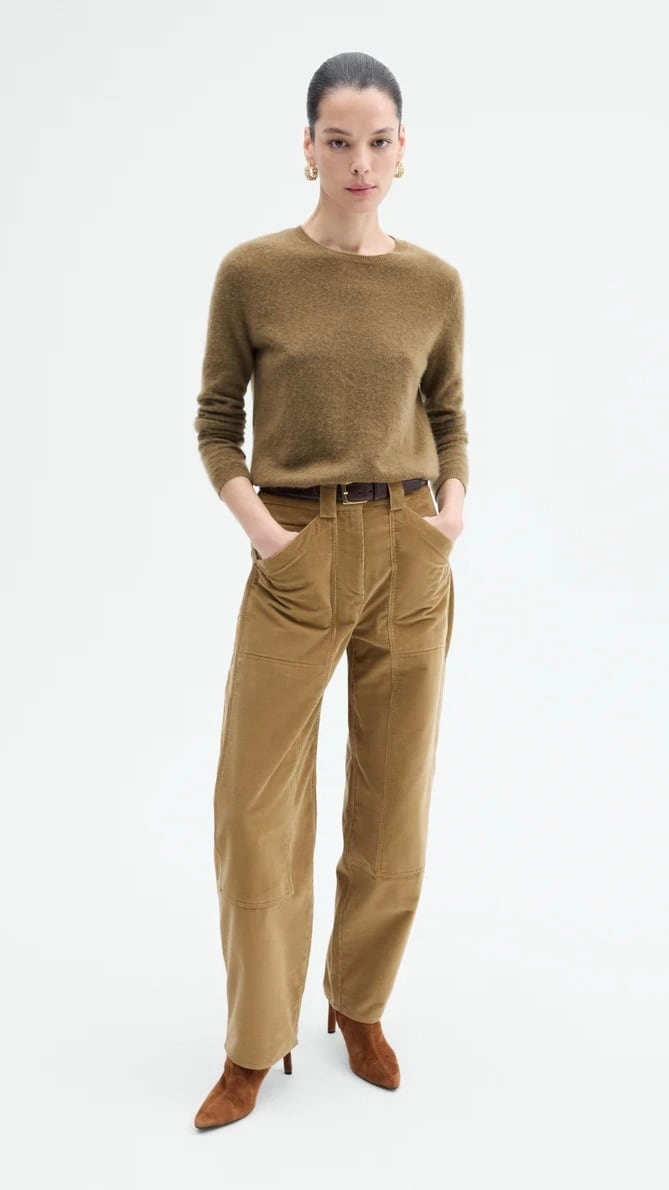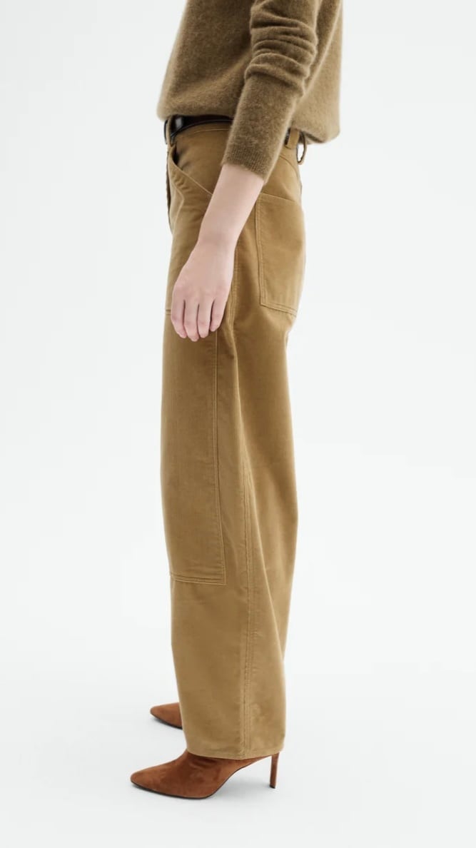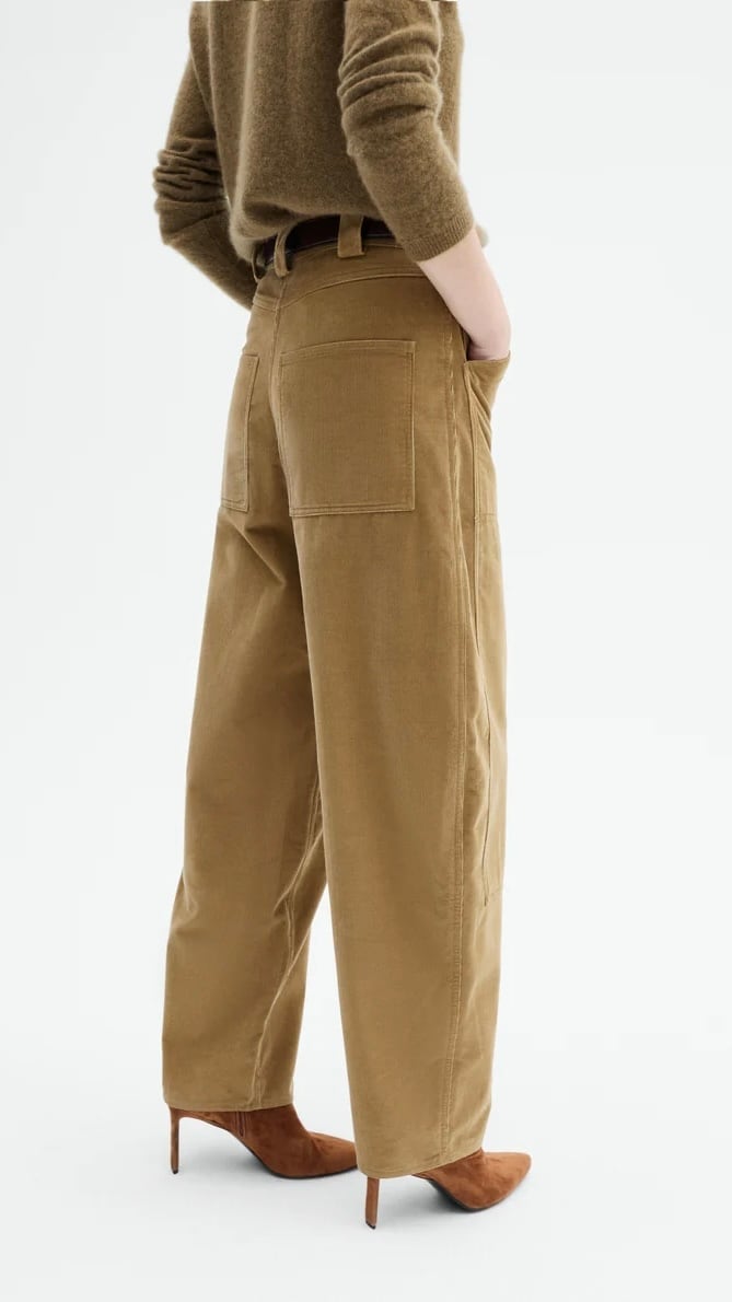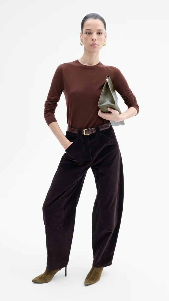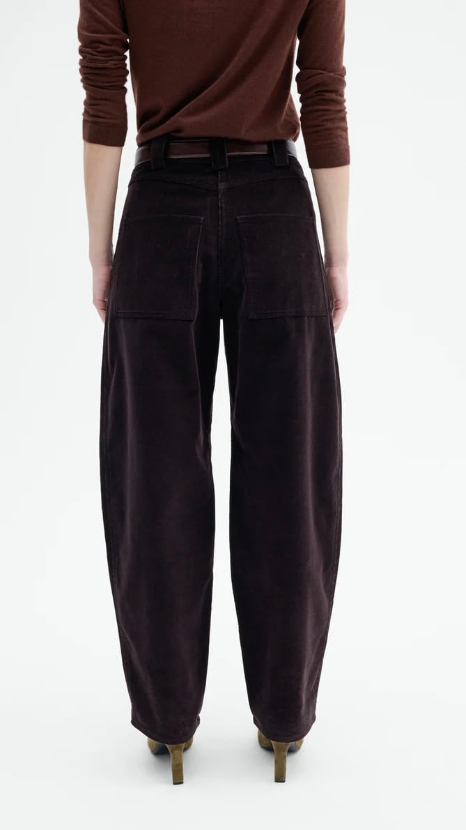 ワイドウールのコーデュロイで作られ、彫刻的なバレルレッグで形作られたハイウエストのズボン。オーバーサイズのパッチポケット、テーラードシーム、すっきりとしたウエストバンドなど、ディテール。濃厚なチョコレートのトーンが次元の表面を高め、構造と使いやすさのバランスをとっています。