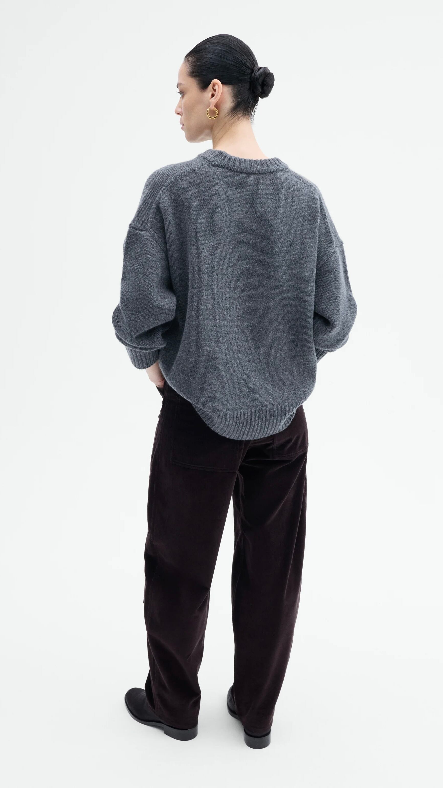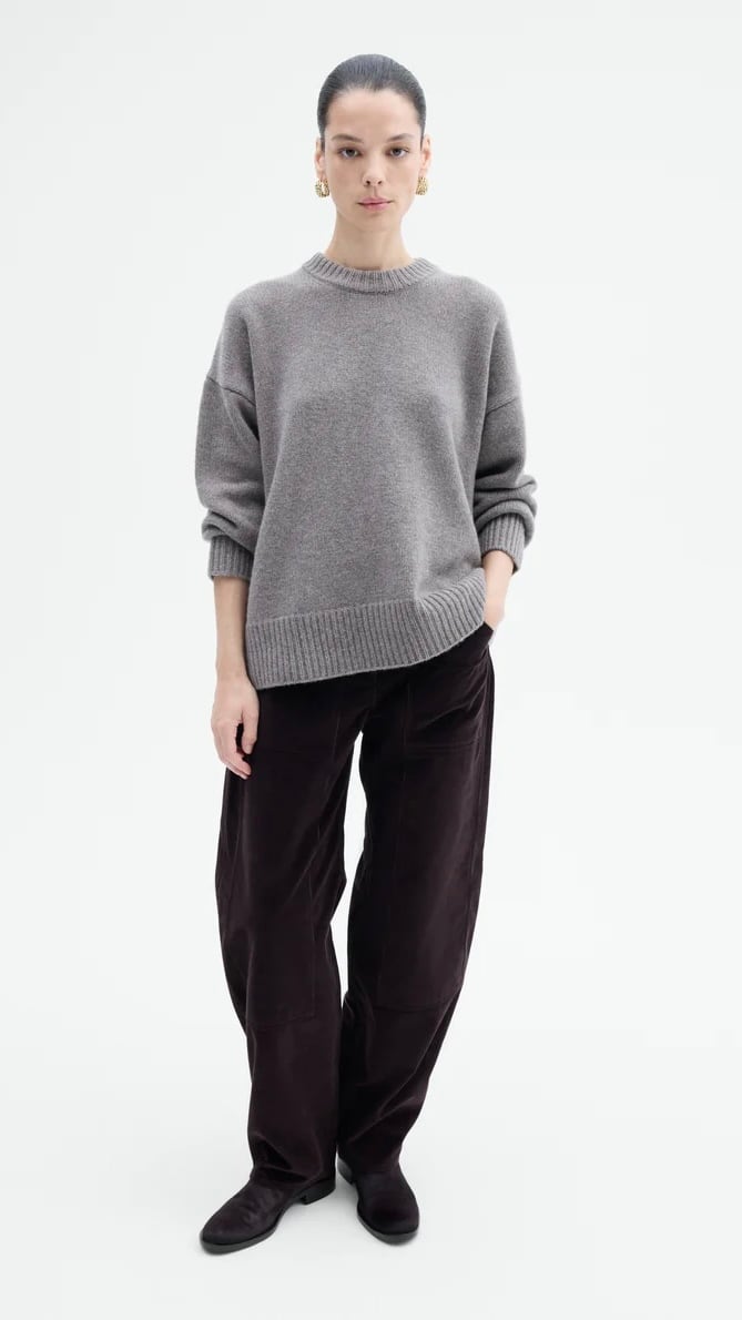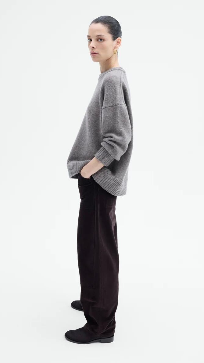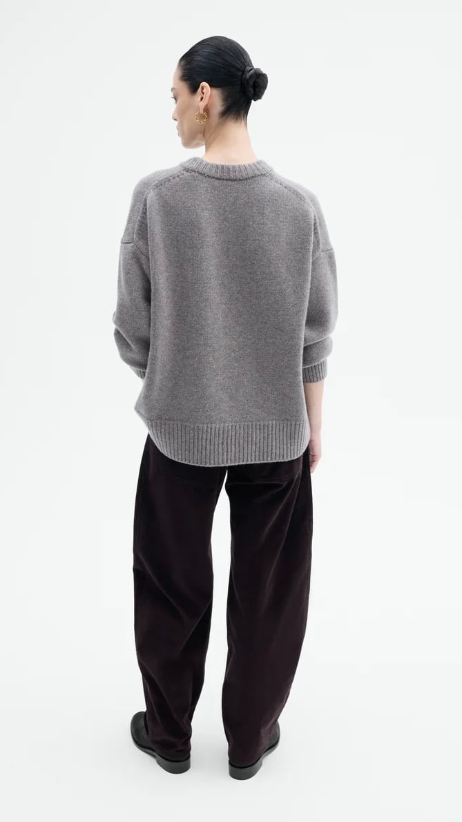 ウールとカシミアの混紡糸を使用した、オーバーサイズで快適なクルーネックセーターです。ネックライン、カフス、裾に時代を超越したリブのディテールが施された、拡張されたシルエットです。