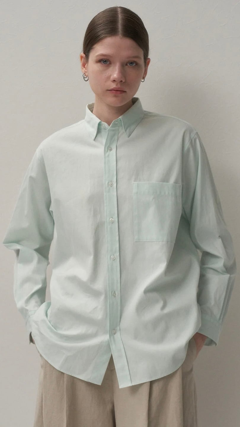 レディースのスタンダートなシャツ。スタンダートなシャツを身幅や着丈を調整し、リラックス感ある着心地に仕上げながら、ドレスシャツのような雰囲気が特徴です。女性ならではの沿った襟ぐりと前下がり設計で、ジャケットのインナーとしてもオススメです。アームホールはゆとりのあるサイズ感でありながら、サイドから見たときにすっきりとした印象になるようパターン設計されています。01サイズはインナーにも使えるジャストな設計、02サイズは身幅をややオーバーサイズなイレギュラーグレーディングにしています。
