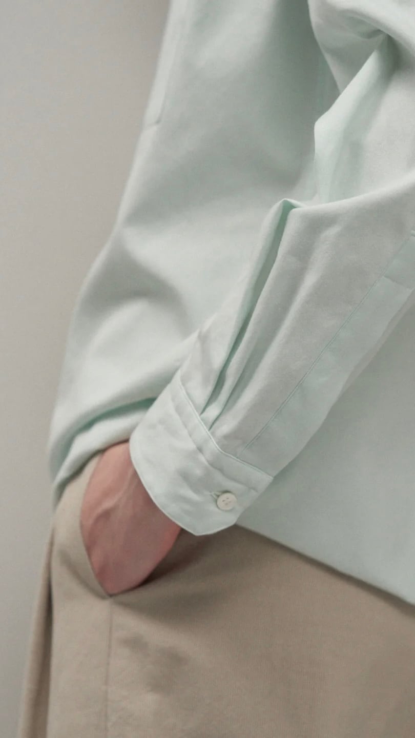 アメリカのスーピマコットンを、兵庫県西脇市の機屋にてやや甘めに織り上げたピンオックスフォードです。時間をかけてゆっくりと揉みこんで仕上げることで、通常のピンオックスフォードにはない、独特の滑らかなタッチとコシが特徴のオリジナル素材です。
