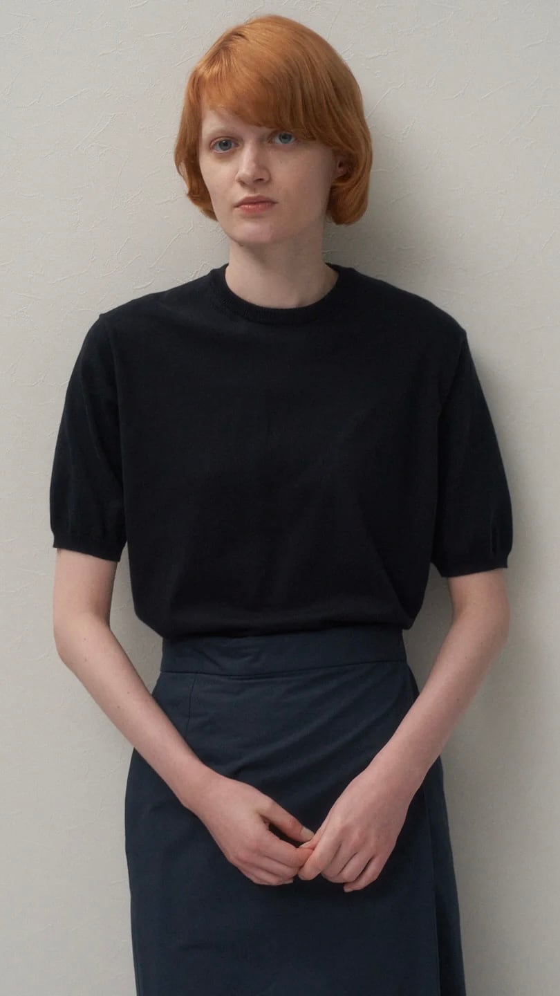 肘にかかるくらいの長めの袖丈のクルーネックニット。袖口にかけてテーパードしながらも甘すぎないパフ分量でTシャツのように着用できます。身頃全体でギャザーのドレープを出しているので、脇の溜まりが少なく、着用した際に美しく見せてくれる1着です。