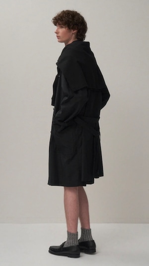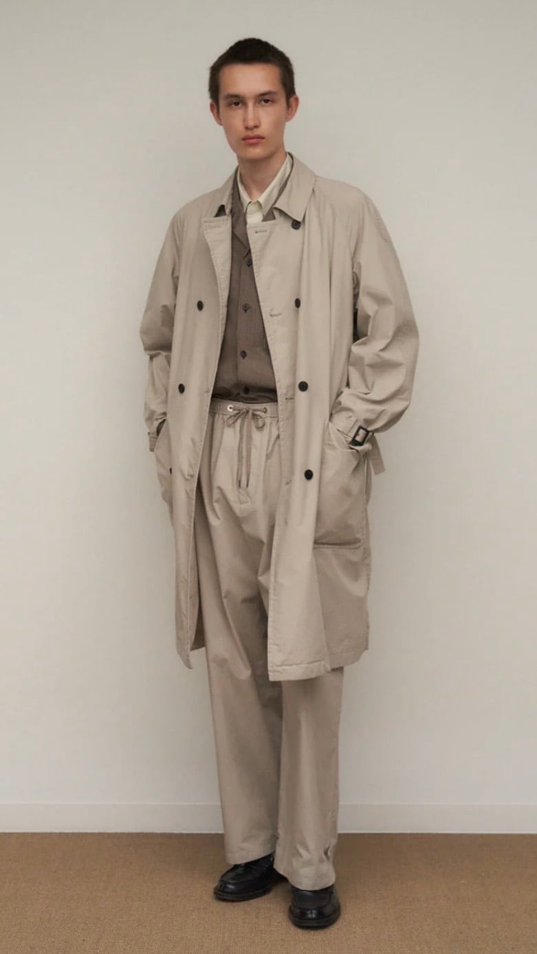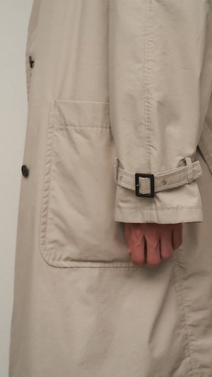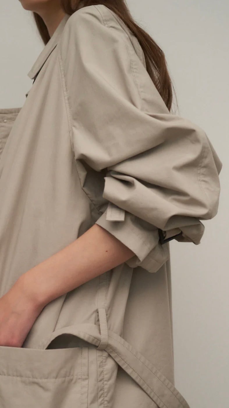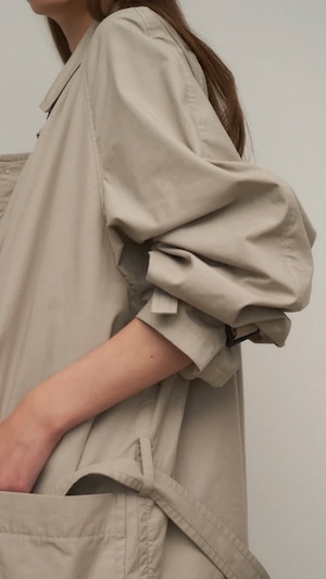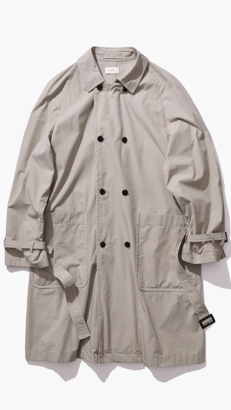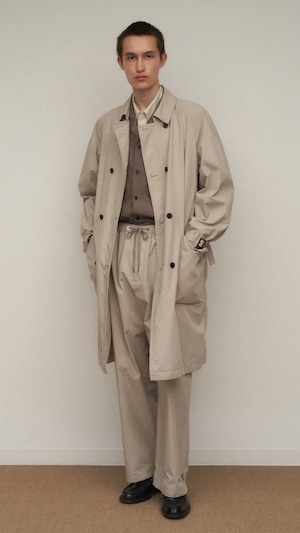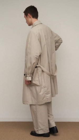 ややAラインのリラックスしたトレンチコート。ベーシックなラグランスリーブのトレンチコートをベースに、ディテールをそぎ落としています。製品でワンオッシュすることで生まれる、表情あるパッカリング感が特徴です。また、ウエストと袖にベルトを付けており、絞ることでまた違ったシルエットを楽しめます。