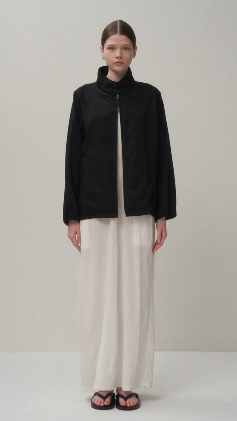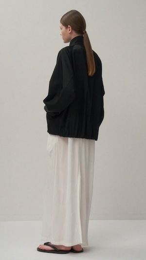裏地もなく、軽く仕立てたブルゾン。通常、レザーのハリントンブルゾンでありそうな雰囲気を、ナイロン素材で作りました。メンズサイズをベースに、袖口・裾口はリブを使用せずゴムを折込んでギャザーを寄せています。マニッシュな印象はキープしながら、女性らしさをプラスしています。