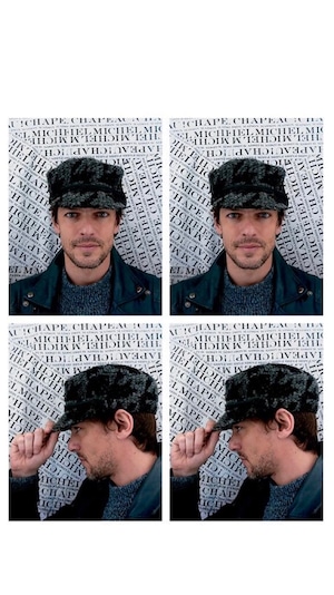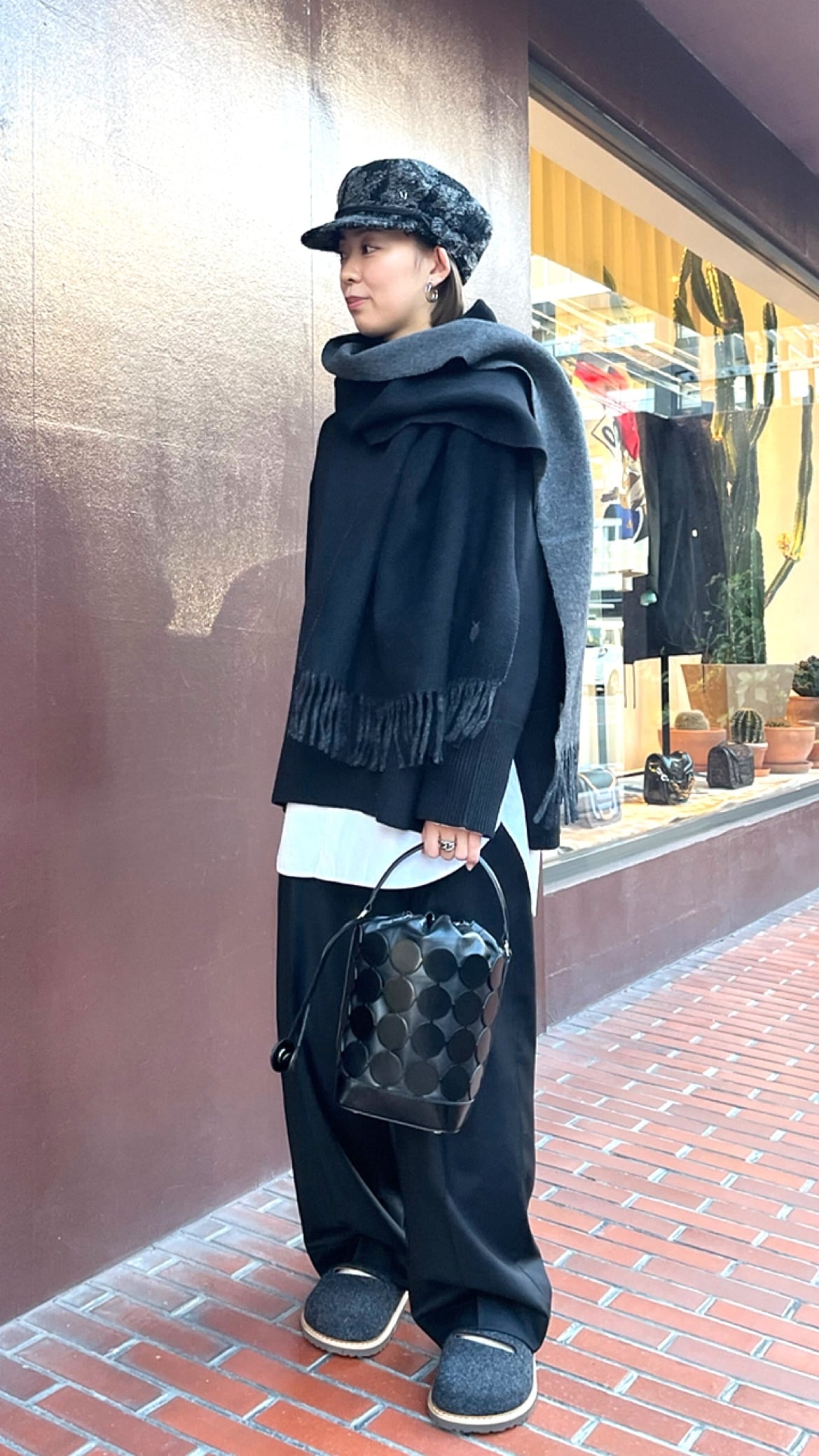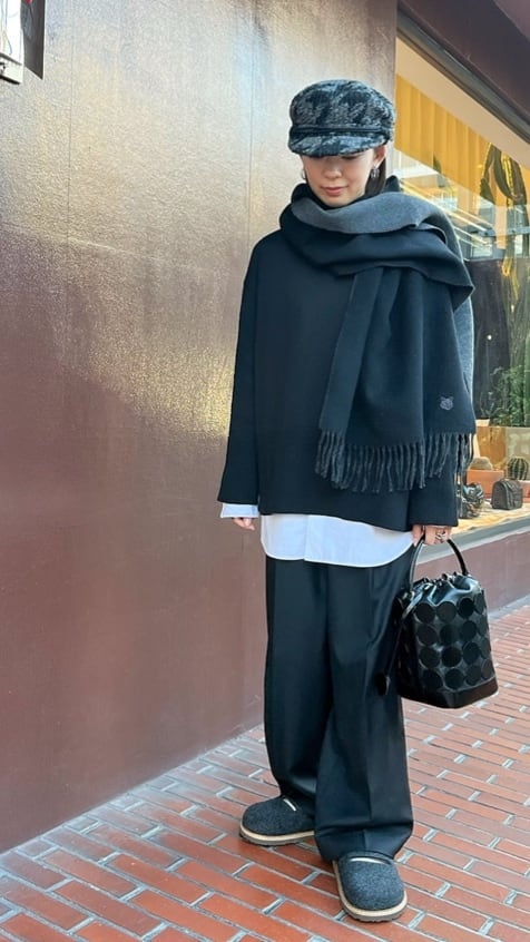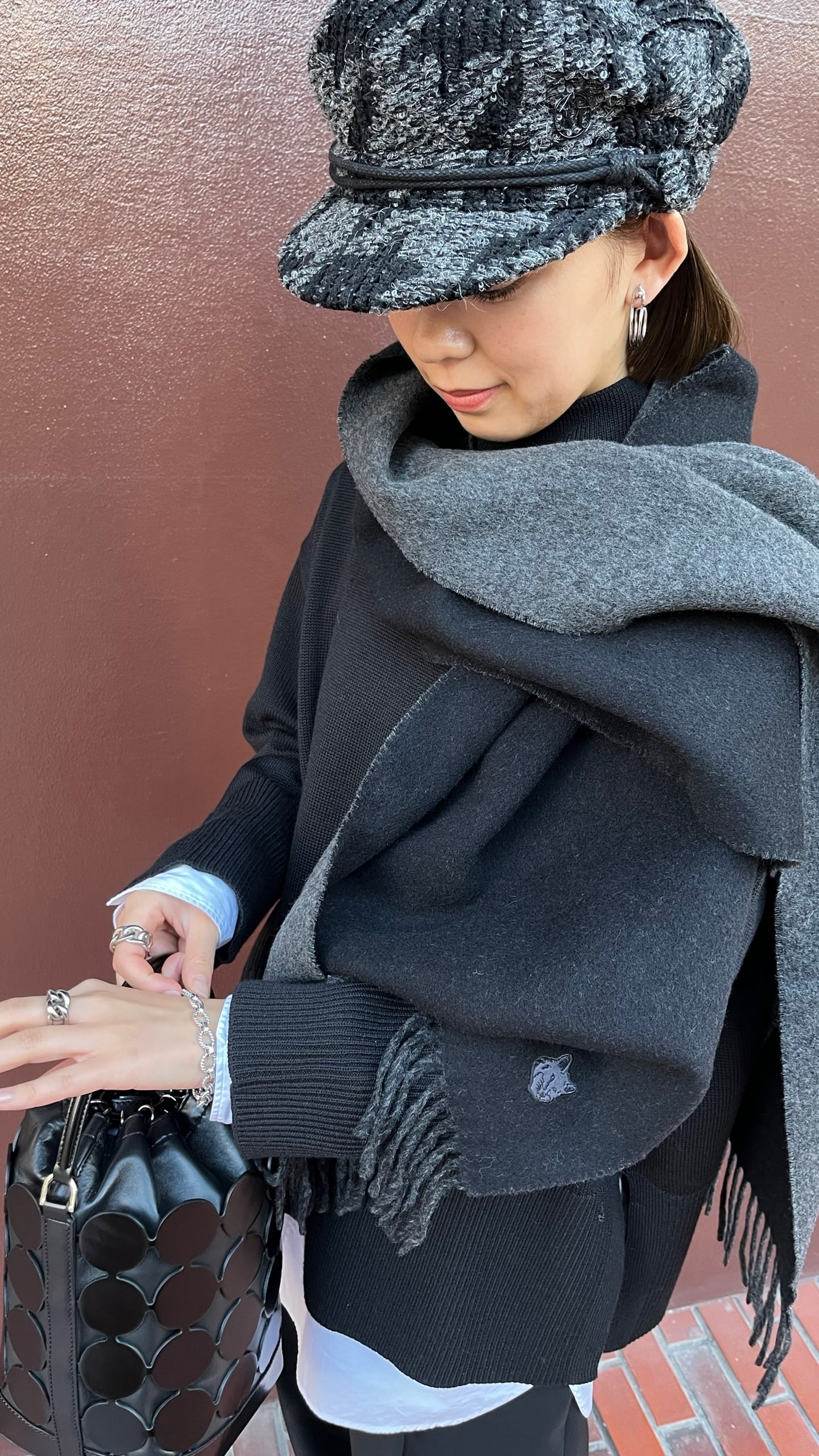 : 黒とグレーのツイードキャスケット、