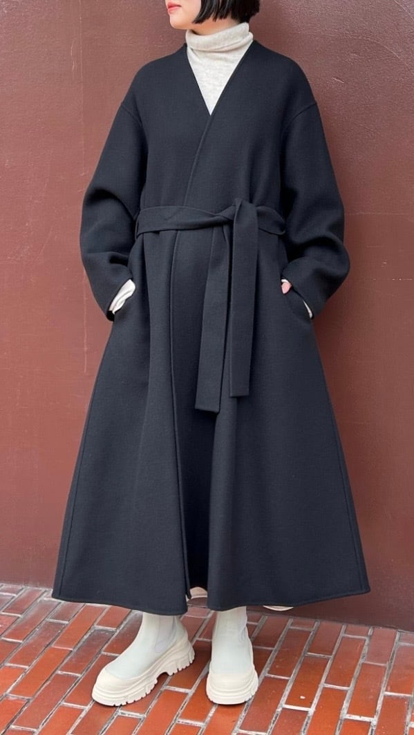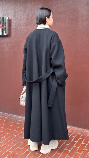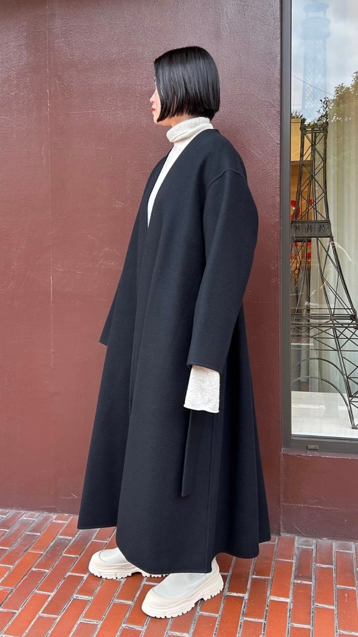 素材のハリを活かしたフレアシルエットが上品なノーカラーコートです。縫い代のないリバー仕立てで分量感に対してた着用時の軽さが特徴です。ワイドパンツやフ レアスカートなどのボトムと相性が良く、釦レスですが、共地のベルト付きでガウンのように絞って着ることもできます。