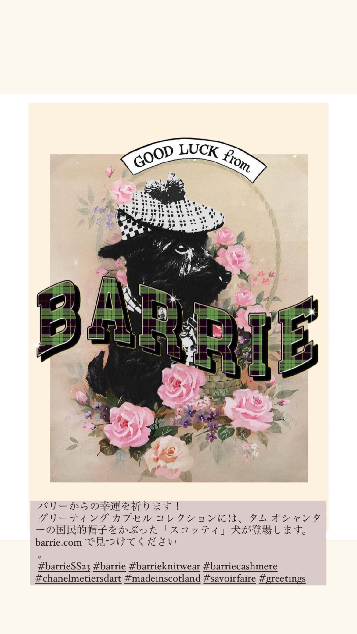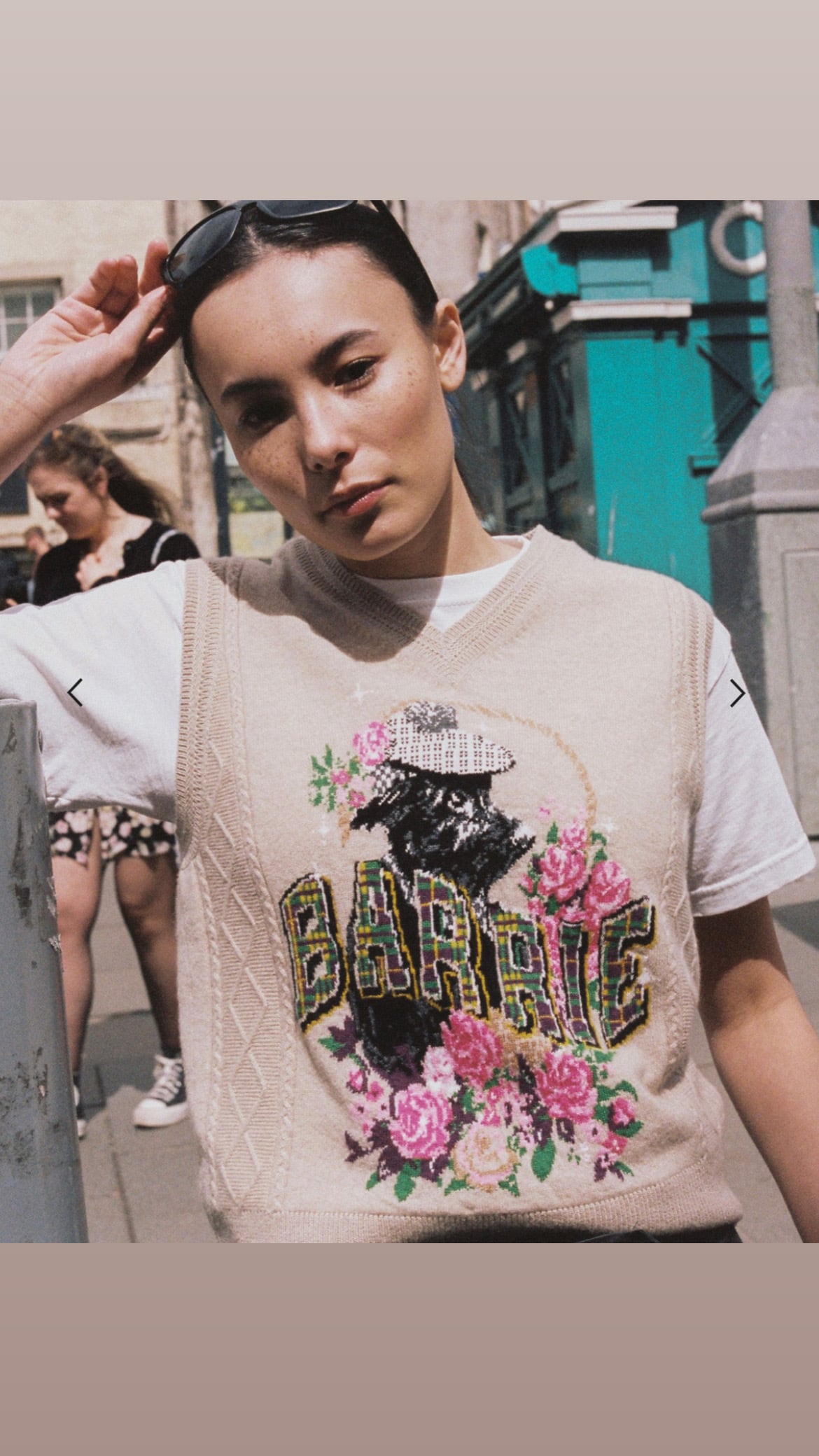 伝統的なタム・オシャンターのビーニー帽をかぶった「スコッティ」と呼ばれる犬が、このベージュのリブニットのノースリーブセーターを着て、バラの花畑の中を歩いています。 バリーのロゴは、メゾンの伝統を反映するタータンチェックのディテールを含むノスタルジックなタイポグラフィーで省略され、セーターは伝統的なニットウェアのコードに現代的なひねりを加えています。