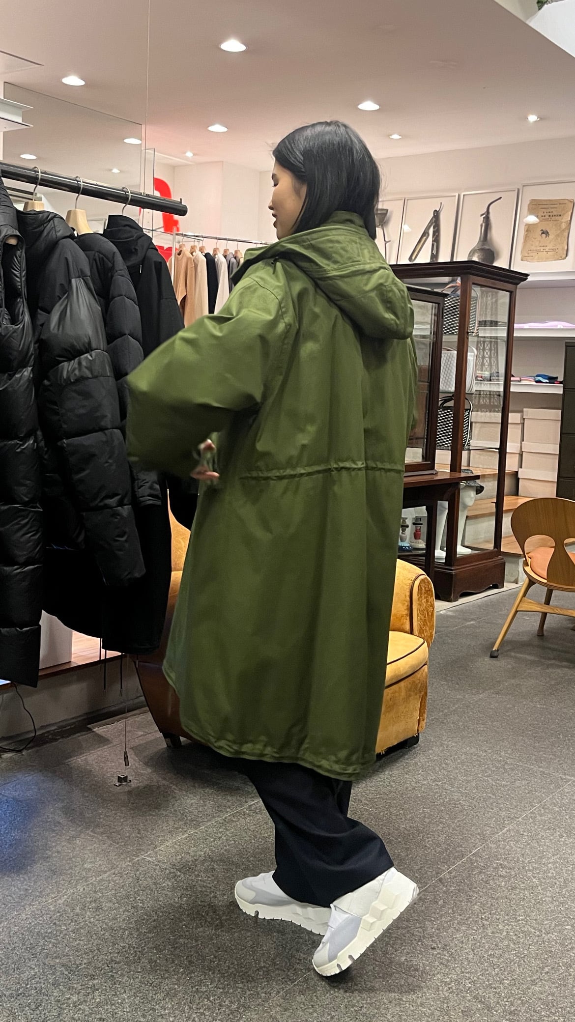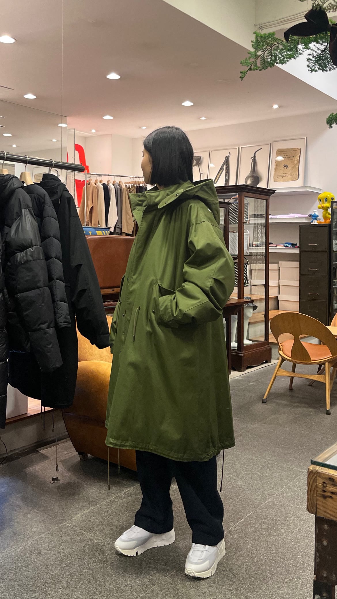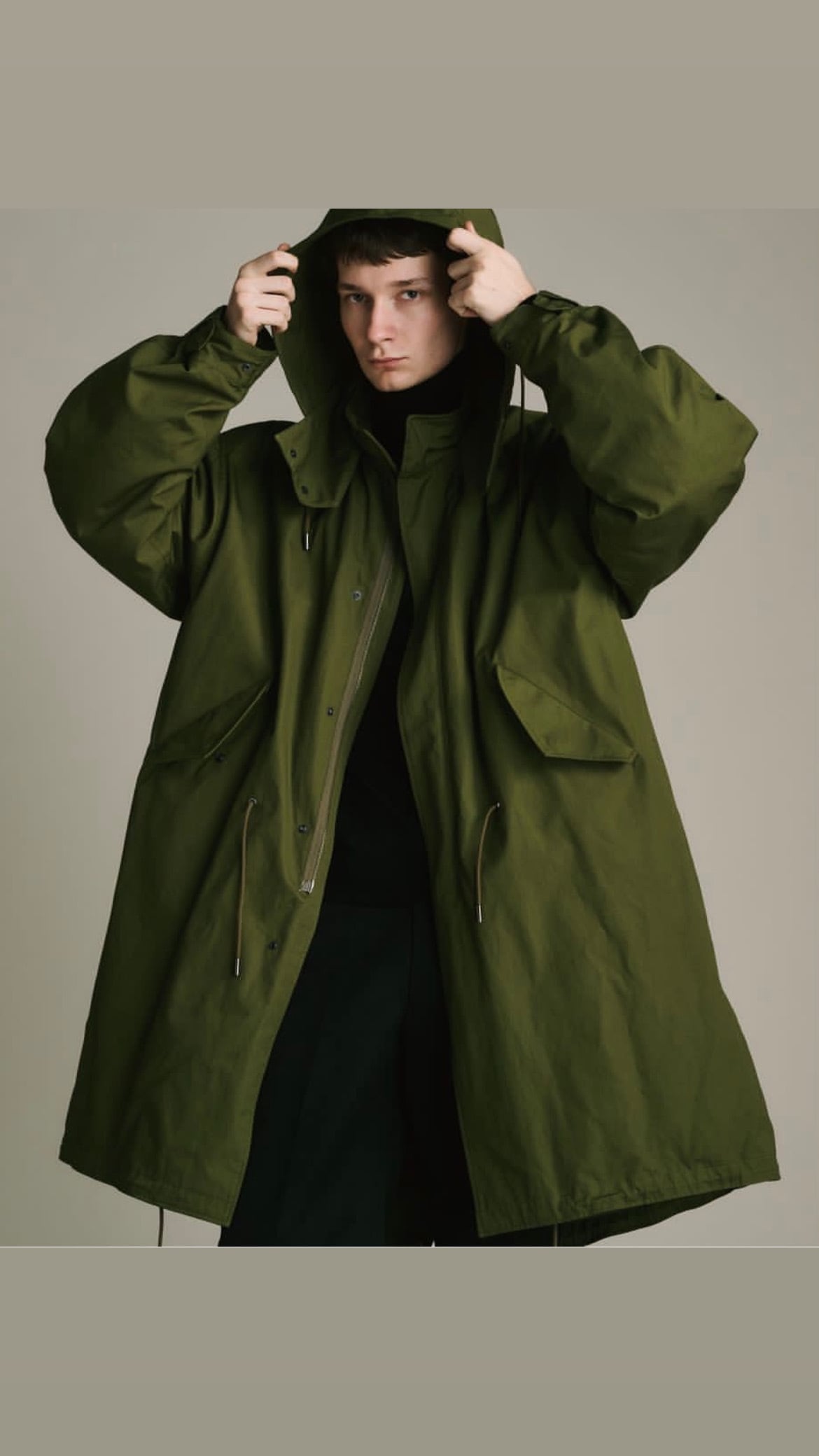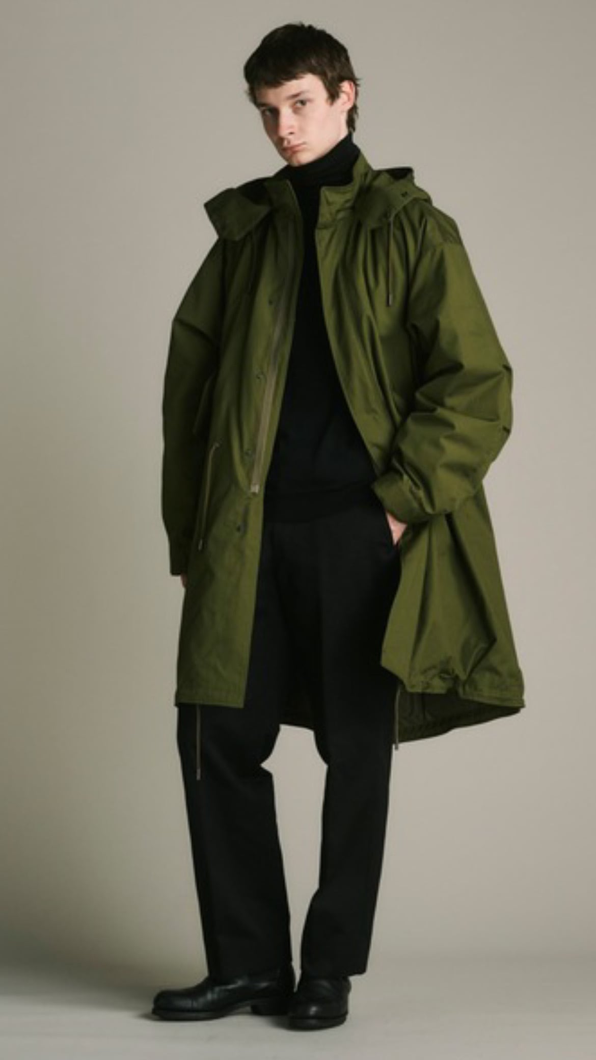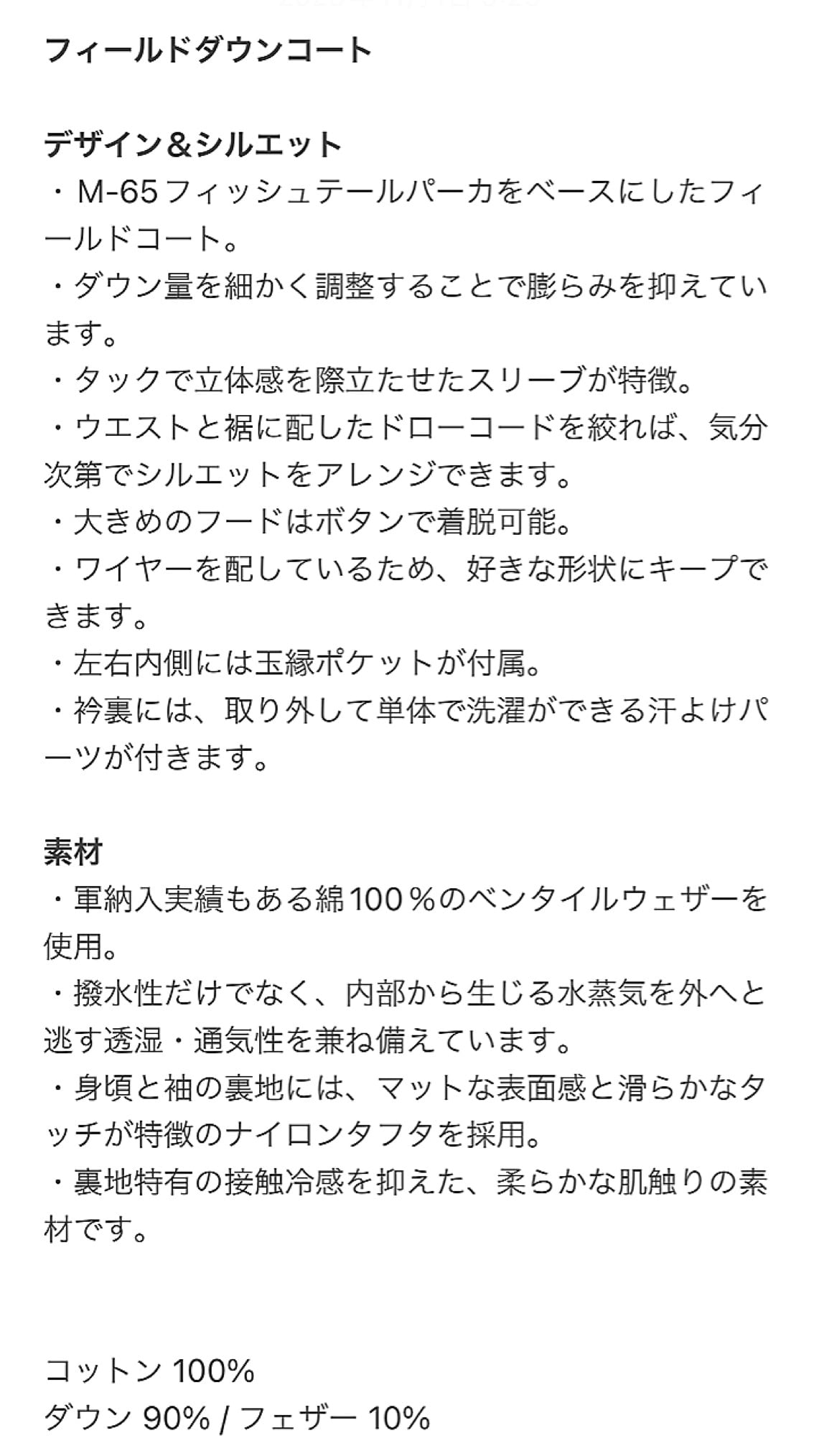 M-65フィッシュテールパーカをベースにしたフィールドコート。ダウン量を細かく調整することで膨らみを抑えています。タックで立体感を際立たせたスリーブが特徴。ウエストと裾に配したドローコードを絞れば、気分次第でシルエットをアレンジできます。大きめのフードはボタンで着脱可能。ワイヤーを配しているため、好きな形状にキープできます。左右内側には玉縁ポケットが付属。衿裏には、取り外して単体で洗濯ができる汗よけパーツが付きます。