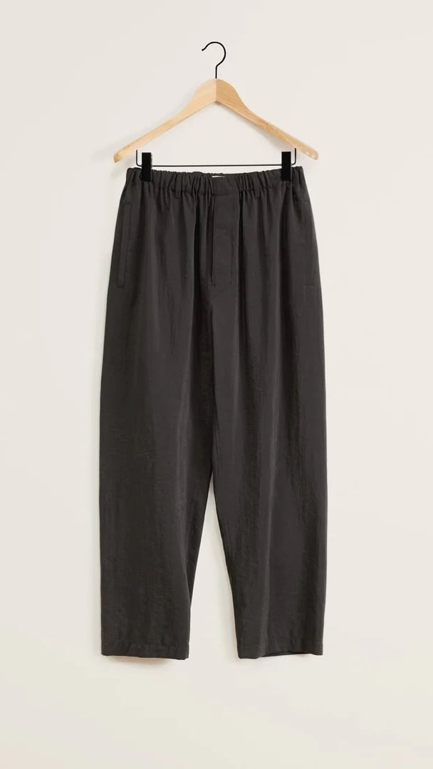 These pants are a staple of LEMAIRE’s wardrobe. They are made of dry silk, a classic LEMAIRE fabric with a soft hand and tonic texture. Their pyjama-like fit is relaxed, achieved by multiple pleats below the elasticated waistband that extend down the leg. Practical details include a buttoned fly with angled stitching and side welt pockets.