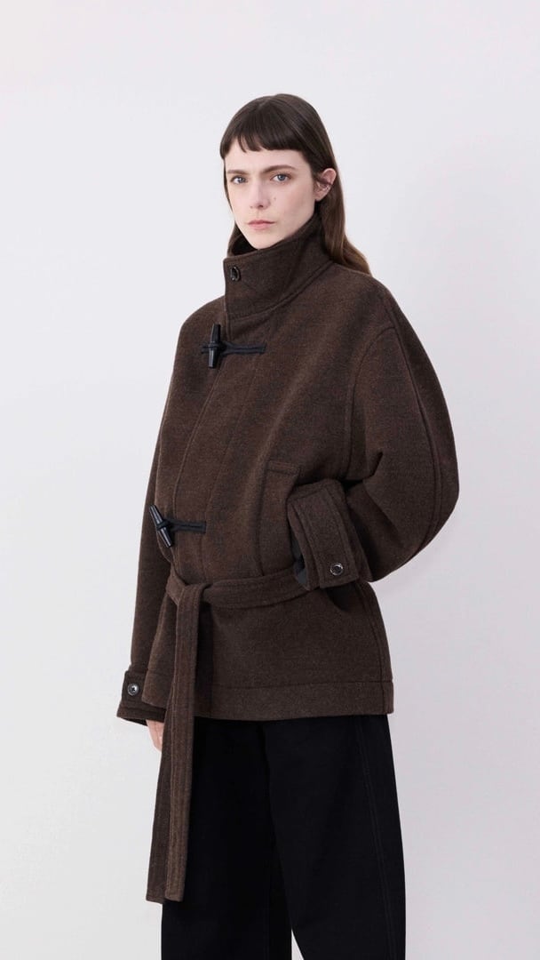 このLEMAIREダッフルコートは、ディープブラウンのチャイナ両面先染めウールで作られており、柔らかくて暖かい手触りです。ショート丈のオーバーサイズシルエットが特徴で、取り外しの可能なベルトでボリュームを調節できます。木製のトグルやコードループなどのクラシックなダッフルのディテールが、ボタン付きのスタンドカラーを備えた隠しボタンの前立てに留められています。大きなウェルトポケットとステッチスルーの内側補強で仕上げられています。