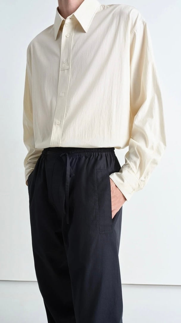 このユニセックスパンツは、LEMAIREが大切にする「イン&アウト」哲学を体現しています。重厚なコットンのウォッシュポプリンで作られ、衣服に構造と快適さをもたらしています。パジャマのようなフィット感はリラックスしたもので、ウエストのゴムの下に複数のプリーツがあり、脚の下部へと延びています。実用的な詳細として、ウエストを結ぶドローストリング、トッピングステッチが施されたボタン付きフライ、サイドのウェルトポケットが含まれています。